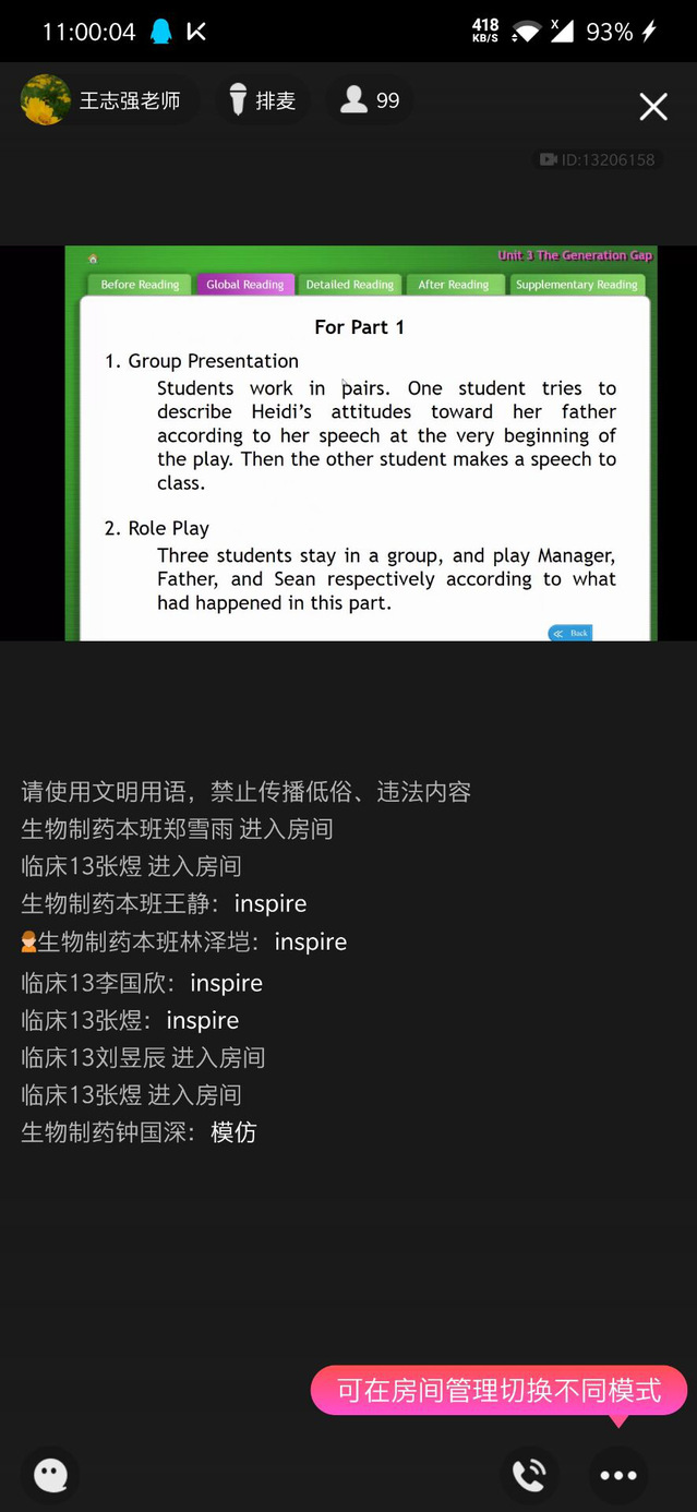 课前,预先发送预习清单:有目的、有针对性地发送课程资源(音频、视频、文档等),让学生们提前预习,熟悉上课材料,做到上课过程有重点地听,有效率地学。同时,老师们精心设计好每一个教学环节,课前在电脑屏幕上打开多个课件、音频,随取随用,最大程度的缩短教学环节之间转换的时间,确保直播教学的流畅性。