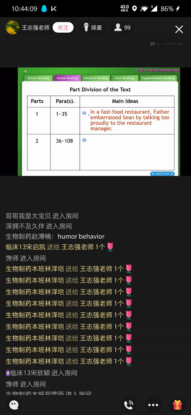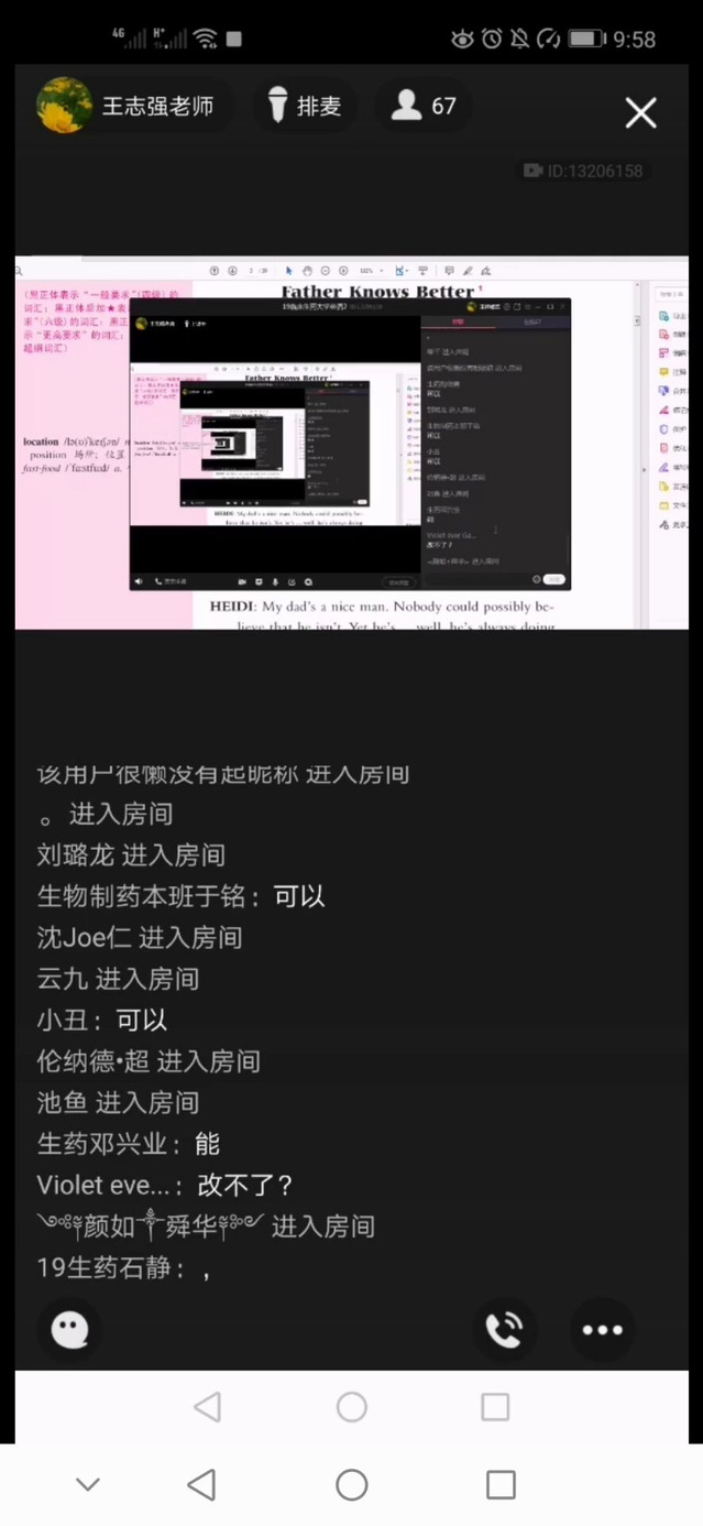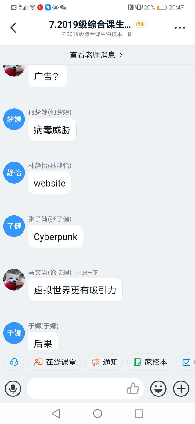 课上采用教师讲授+学生参与活动的方式,充分调动学生上课积极性。首先检查上节课的作业情况,作业课前已经以班级为单位收集至教师处,教师选取部分作业进行展示,并对存在问题进行其中讲解和答疑。然后进行讲授环节,期间教师采用学生为主体的教学方式,启发式讲授过程,以学生为中心,引导学生解决课前预习时存在的问题和对重点难点知识的把握。学生活动方式一般采取问答形式,要求学生在规定时间发语音、图片等至班级群,进行交流和反馈。或者以语音连线方式参与学生话题讨论,指导学生学习。通过学生参与课堂讲授环节,充分调动了同学们的上课关注度,让学生真正参与课堂,成为课堂的主人。