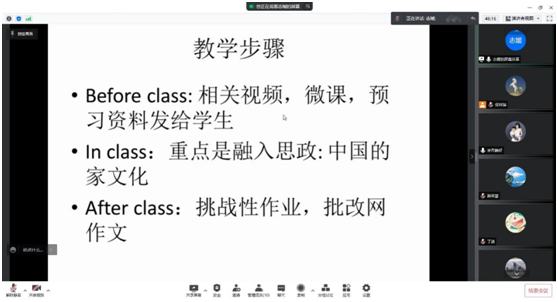 随后,主备教师韩志媛立足教学目标和线上教学实际,对主备单元的教学重难点、教学策略和教学设计进行了详细说明。并围绕单元主题,韩老师着重挖掘了思政元素,在教学中融入中国的家文化介绍,突出家风家教的作用和孝道文化的传承,并设计了让学生进行辩证思考,口语表达和书面写作的高阶任务,注重培养学生的综合素养。