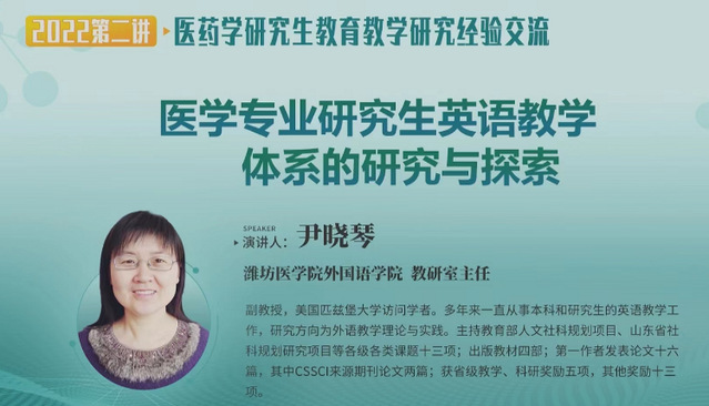 尹晓琴老师以“医学专业研究生英语教学体系的研究与探索”为主题,结合自身的教学科研实际,从我国医学研究生英语教学现状,基于需求的医学专业研究生英语教学体系的构建等方面做了汇报发言。
