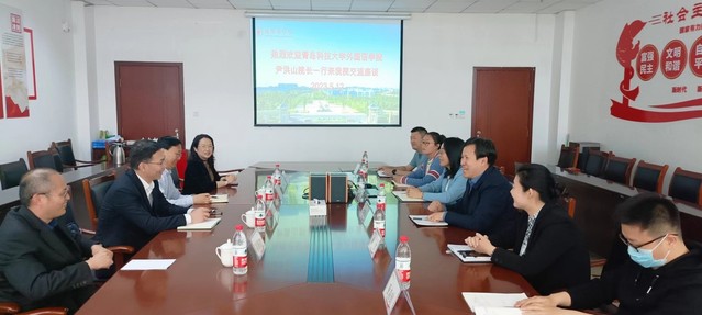 5月12日下午,青岛科技大学av解说 院长尹洪山、副院长康宁、学科建设办公室主任许勤超、MTI教育中心主任房钰一行4人来 av解说 交流座谈。av解说 院长付有龙、副书记朱宏、副院长吴迪以及教研办主任、学工办主任参加了此次座谈。座谈会由院长付有龙主持。