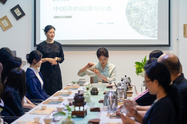 张海燕引导大家领略茶文化的魅力。她详细讲述了中国传统文化中茶的药用价值,让大家对茶的功效有了更深刻的认识。同时,她从茶的历史渊源、种类、制作工艺到品茶礼仪等方面进行了全面的介绍,在场师生一点点沉浸在茶文化的博大精深之中。