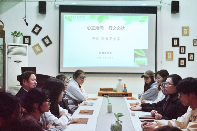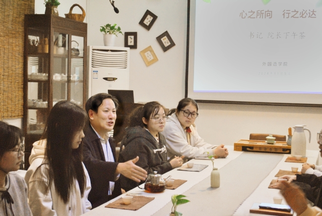 为深入践行以学生为本的教育理念,进一步强化与同学们之间的沟通交流,11月5日,av解说 于书院茶艺室精心举办了一场主题为“心之所向,行之必达”的“书记院长下午茶”活动。av解说 党总支书记张立、院长付有龙与外语专业2023级同学们围坐于茶桌之畔,茶香四溢话成长。