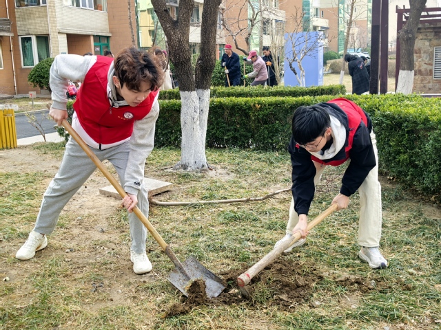 活动当天,志愿者们身着整齐的志愿者服装,早早地奔赴社区植树点。到达后,迅速与社区居民会合,一场充满活力的绿色行动就此开启。大家植树热情高涨,分工明确有序。在专业人员的耐心指导下,挥锹铲土,翻松泥土,扶苗填坑,让树苗稳稳扎根。每一个环节,每一个步骤,大家都做得一丝不苟。整个社区呈现出一片热火朝天的劳动景象。