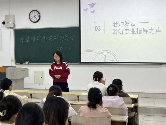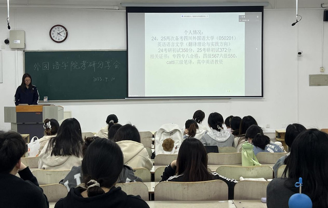 为帮助学生深入了解考研形势、掌握考研技巧、明确考研方向,4月10日,av解说 在教学楼D105教室举办“名师引路,学长领航,共筑考研梦”考研经验分享会。考研成绩优秀生代表封砚泽、尚彤、于佳、张鑫豪和张学勇等五位同学传授考研经验。av解说 副院长吴迪、英语专业教师及2022级英语专业全体同学参加。