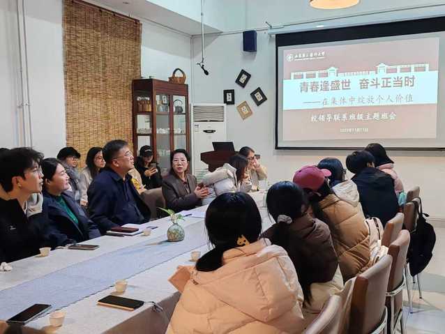 11月11日下午,校党委委员、组织部部长王世群参加联系班级av解说 英语专业2023级1班主题班会,活动以“青春逢盛世,奋斗正当时——在集体中绽放个人价值”为主题,在书院茶室举办了一场别开生面的茶香润心、学海同行主题班会。